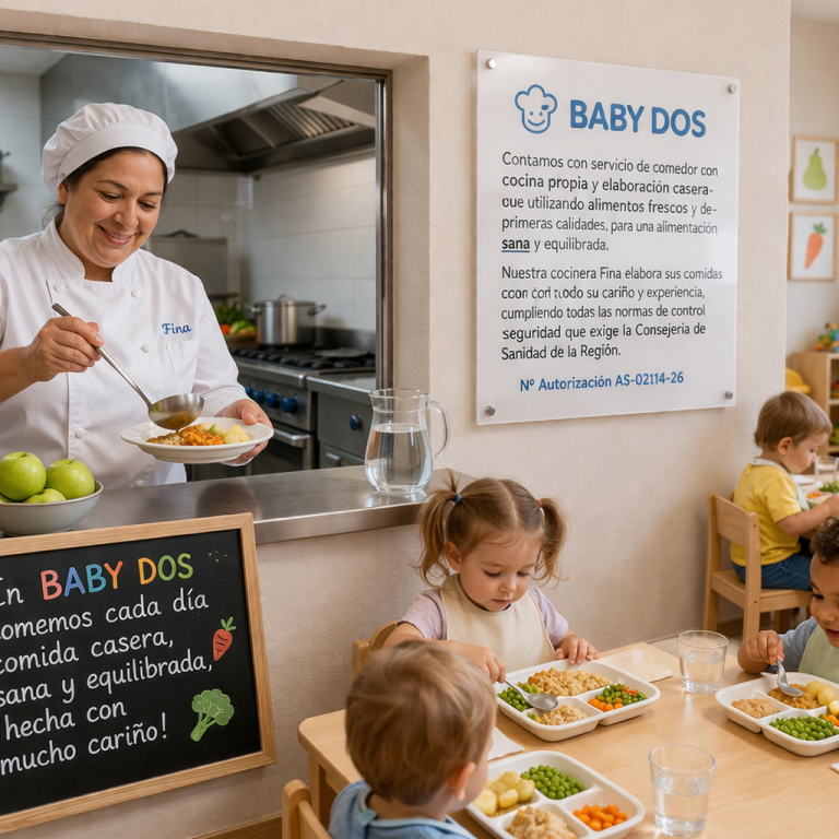 BABY DOS cuenta con servicio de comedor con cocina propia y elaboración casera utilizando alimentos frescos y de primeras calidades, para una alimentación sana y equilibrada. Nuestra cocinera Fina elabora sus comidas con todo su cariño y experiencia, cumpliendo todas las normas de control y seguridad que exige la Consejería de Sanidad de la Región (Número Autorización AS-02114-26).